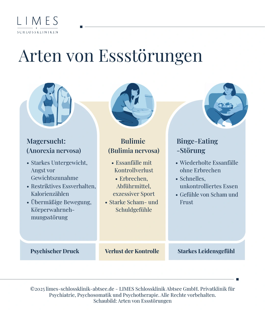 Essstörungen manifestieren sich in verschiedenen klinischen Bildern, wobei die Übergänge fließend sein können und Mischformen keine Seltenheit darstellen. Die spezifische Form beeinflusst die akuten körperlichen Risiken sowie die notwendigen therapeutischen Schwerpunkte während der Behandlung. Alle Formen haben jedoch den enormen psychischen Leidensdruck und die zwanghafte Beschäftigung mit Nahrung, Gewicht und Körperform gemeinsam, welche das alltägliche Leben dominiert. Es ist wichtig, die Unterscheidung der Hauptformen zu kennen, um die Symptomatik richtig einordnen und frühzeitig eine gezielte Behandlung einleiten zu können. Nur eine präzise Diagnose ermöglicht einen maßgeschneiderten Therapieplan.