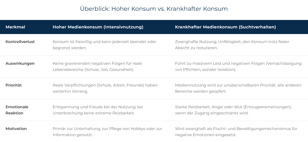 Der zentrale Unterschied liegt im Grad des Kontrollverlusts und den negativen Folgen für das reale Leben. Hoher Konsum kann bedeuten, dass ein Jugendlicher gerne spielt oder viel streamt, aber dennoch jederzeit aufhören kann, wenn wichtige Aufgaben oder Verpflichtungen rufen und keine negativen Folgen entstehen. Beim Suchtverhalten hingegen führt der Konsum zu Leid und Beeinträchtigung: Schlaf wird geopfert, die Schule wird geschwänzt, Freundschaften zerbrechen, aber das Verhalten wird dennoch beibehalten. Ein hoher Konsum ist freiwillig und situativ, während Sucht zwanghaft ist und eine unüberwindbare Priorität im Leben des Betroffenen einnimmt, die therapeutische Intervention erfordert. Die Folgen für das reale Leben sind das entscheidende Kriterium.